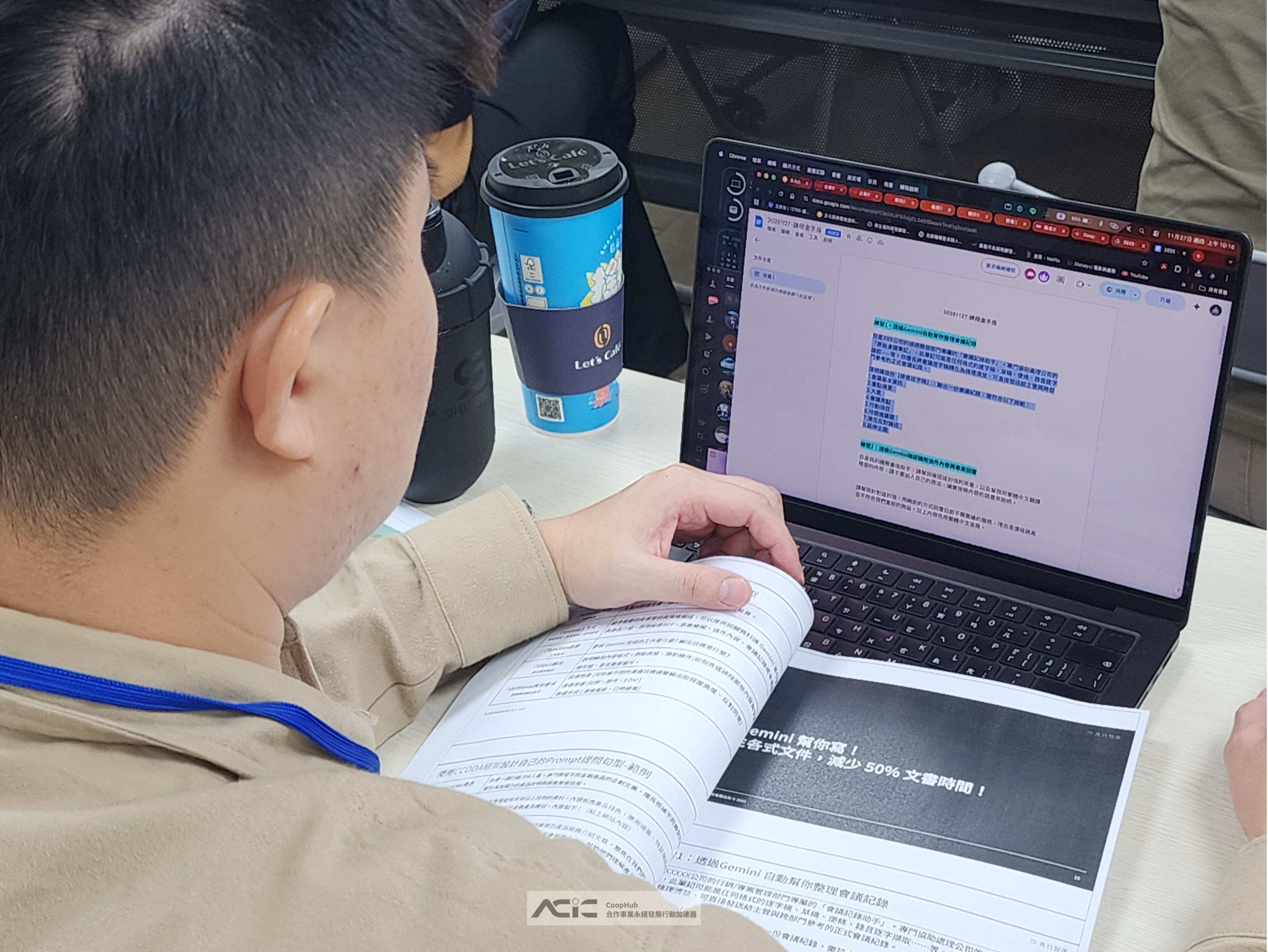 課程以 Vital OD(AI 電子公文管理系統)、Vital Finance 與 AI Buuking(財務管理系統) 為核心導入工具,並結合 Gemini及NotebookLM 等生成式 AI,輔助文書撰寫、會議整理與重點彙整。透過循序導入與情境實作,逐步提升行政效率並降低人工作業風險,並建立可追溯、可制度化及可延續的數位流程。本計畫得以圓滿推動,成果順利達成。